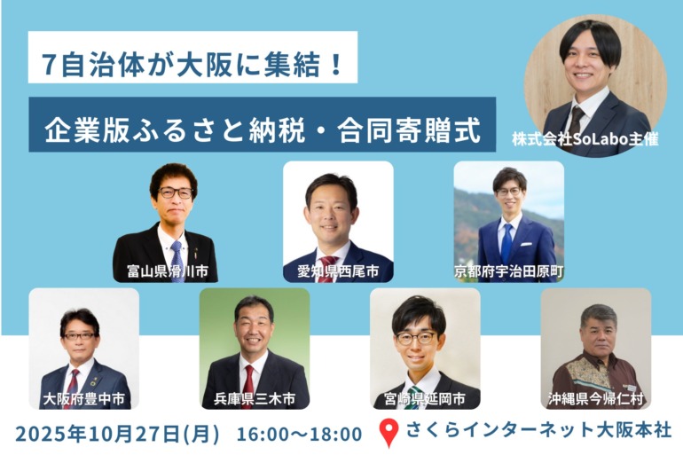7自治体が大阪に集結!企業版ふるさと納税・合同寄贈式を2025年10月27日開催 ~株式会社SoLaboが自治体と事業者の橋渡しとなり、全国規模での企業版ふるさと納税の活用を促進~株式会社SoLabo2025年9月30日 08時30分1
